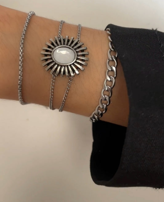 Pulseira com pingente lua de aço e corrente cartier quadrada