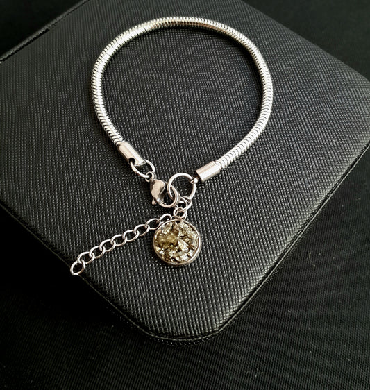 Pulseira rabo rato grossa com pedra pirita pendurada de aço
