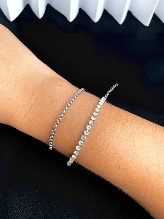 Pulseira tripla fio strass e corrente cartier quadrada