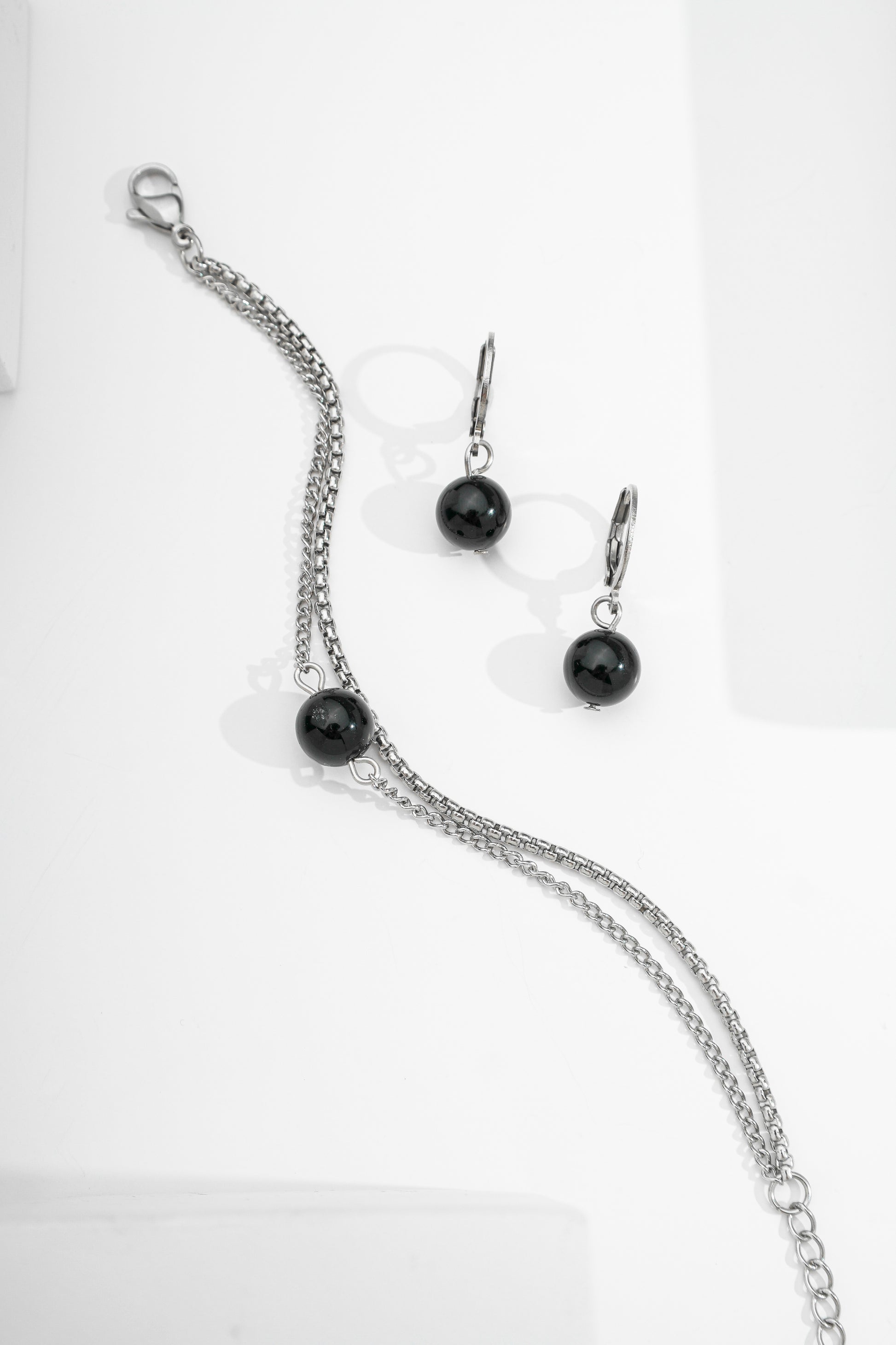 Conjunto pedra natural ônix bolinha Pulseira dupla e argolinha de aço